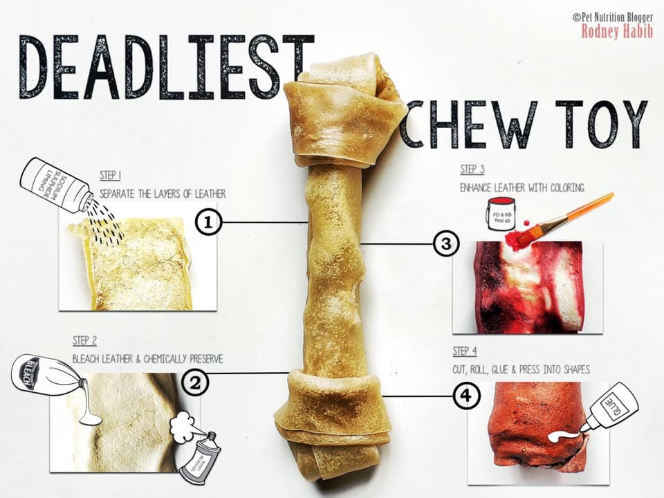 The following is a paraphrased tutorial by The Whole Dog Journal from a few years ago. It explains in scary detail just how this toxic leather is processed and how it ends up in cute little enticing shapes and marketed directly to unassuming Pet Parents who innocently believe that rawhide is a dried “meat stick” and will release stress and reward our fury BFF’s with hours of fun. Wrong!